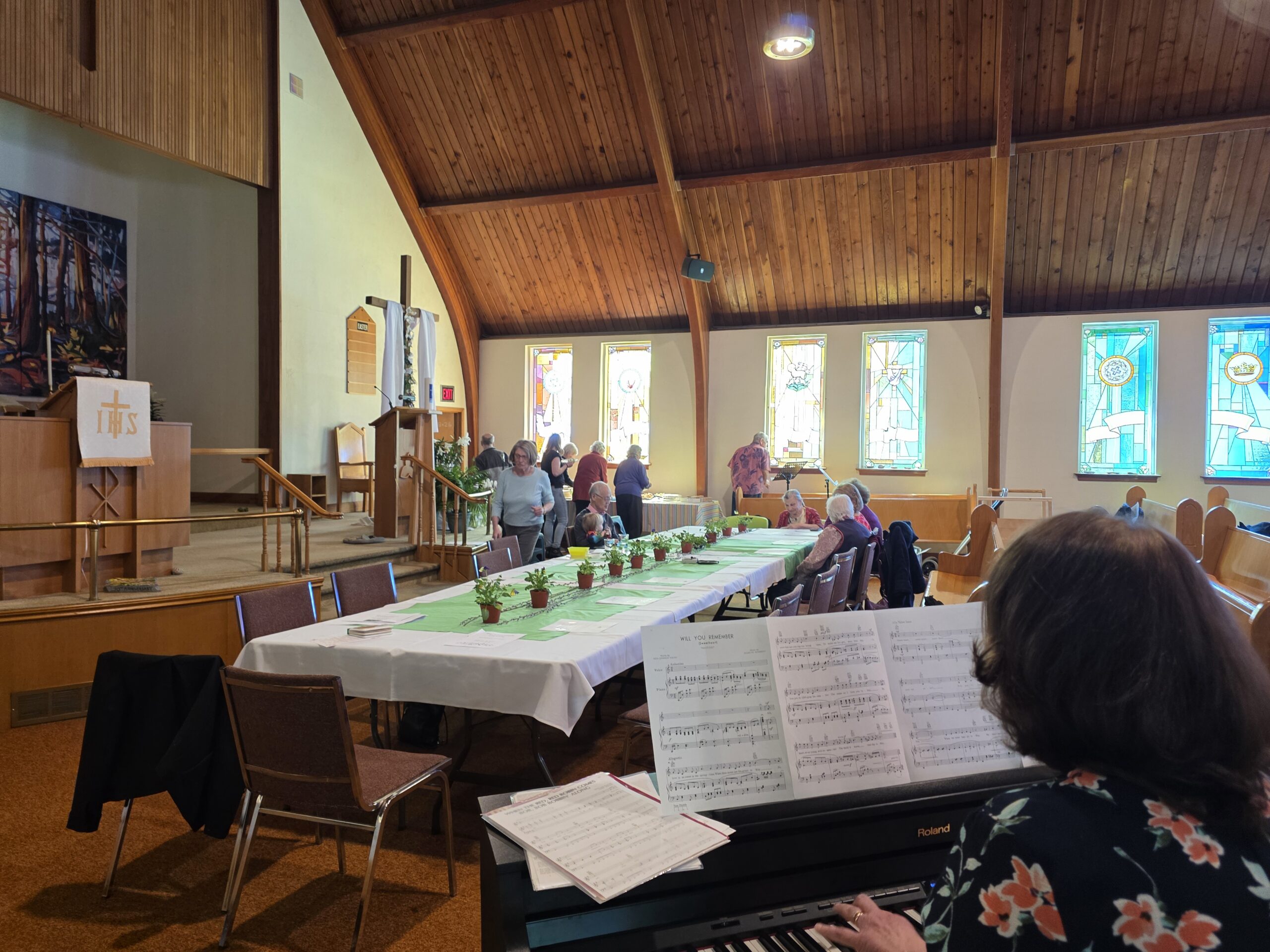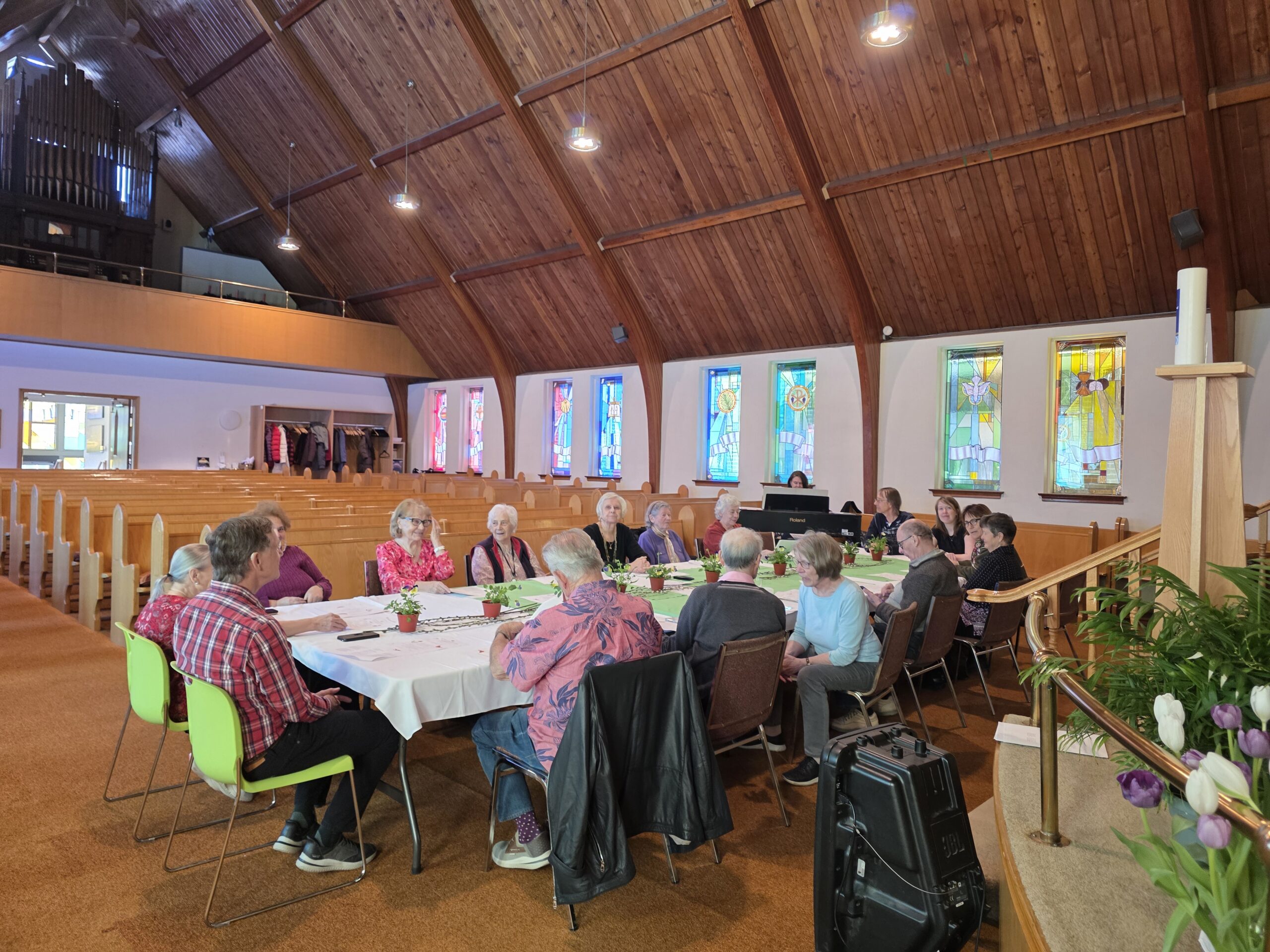 With many seniors already attending the Holy Week services –culminating in Easter Sunday itself– it was unclear whether anybody would again make their way to our Martin Luther Church on the Lakeshore a mere three days after Easter. So, it was a pleasant surprise to be able to welcome a fair number of our dedicated and willing Seniors–neither hindered by illness nor other commitments from again making the journey–to MLC, where we all gathered in the church nave to celebrate the arrival of spring. A colourful table with vernal decor and the accompaniment of lovely piano music by Linda Marcinkus set the mood for spring.