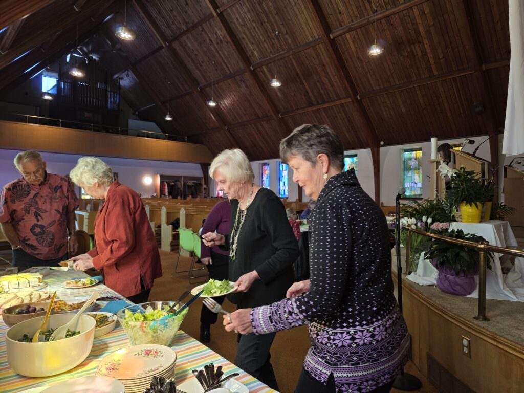 We shared what we typically associate with spring, and what rituals we have when the season begins. Everybody joined in singing well known folk songs accompanied by Linda before a delicious lunch of quiches and salads was served. A prayer and blessing provided by Pastor Annika Klappert sent us on our way at 1pm.