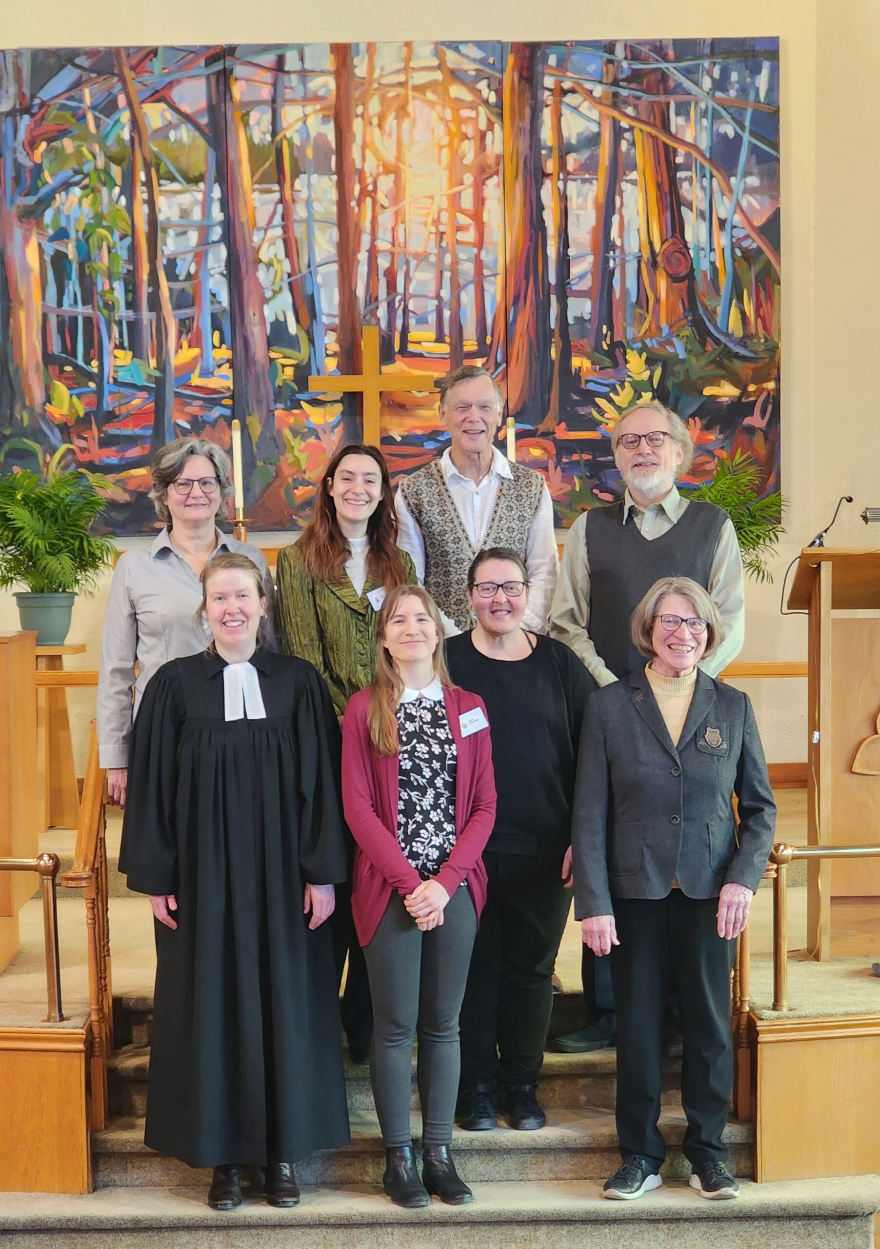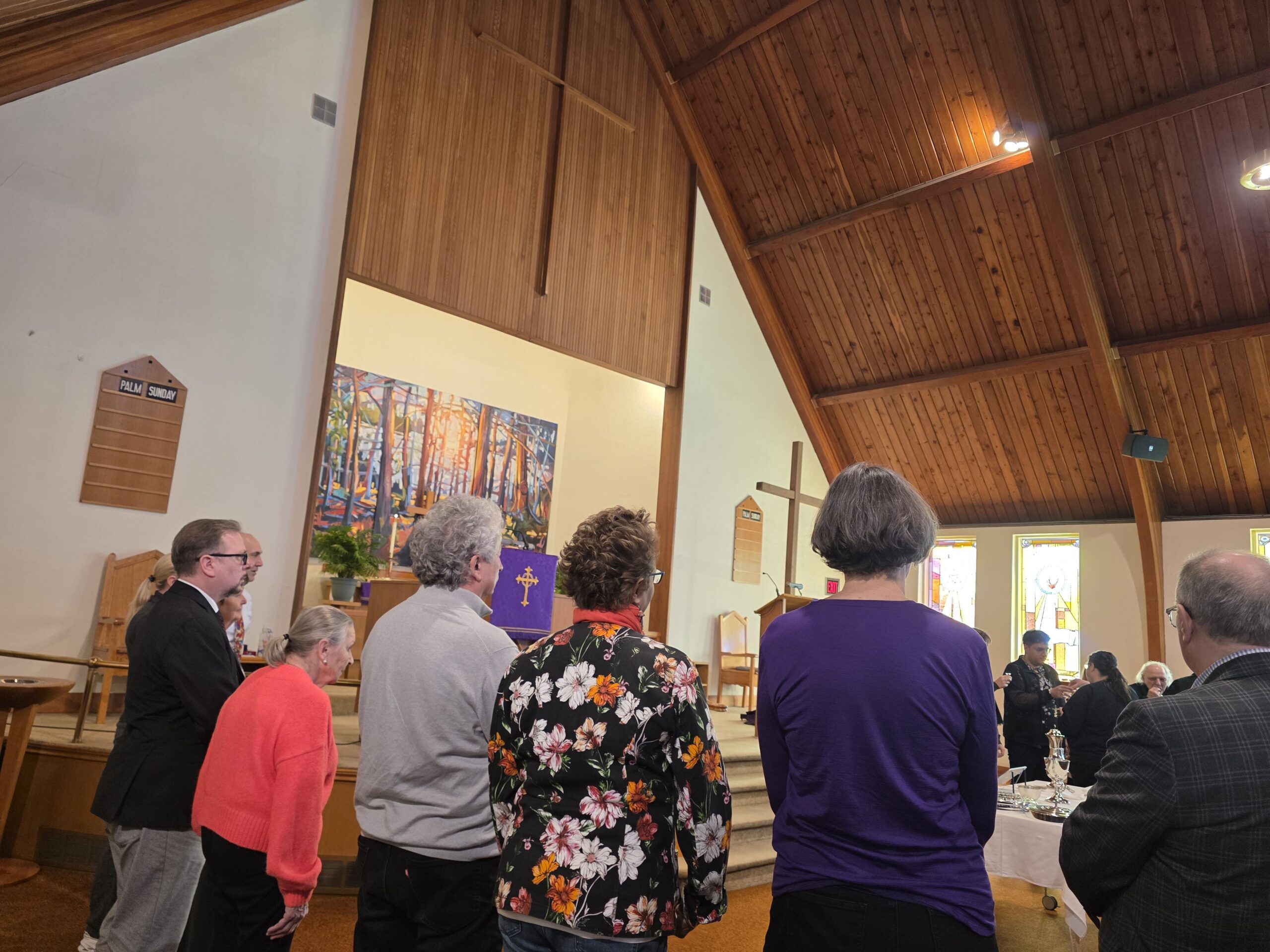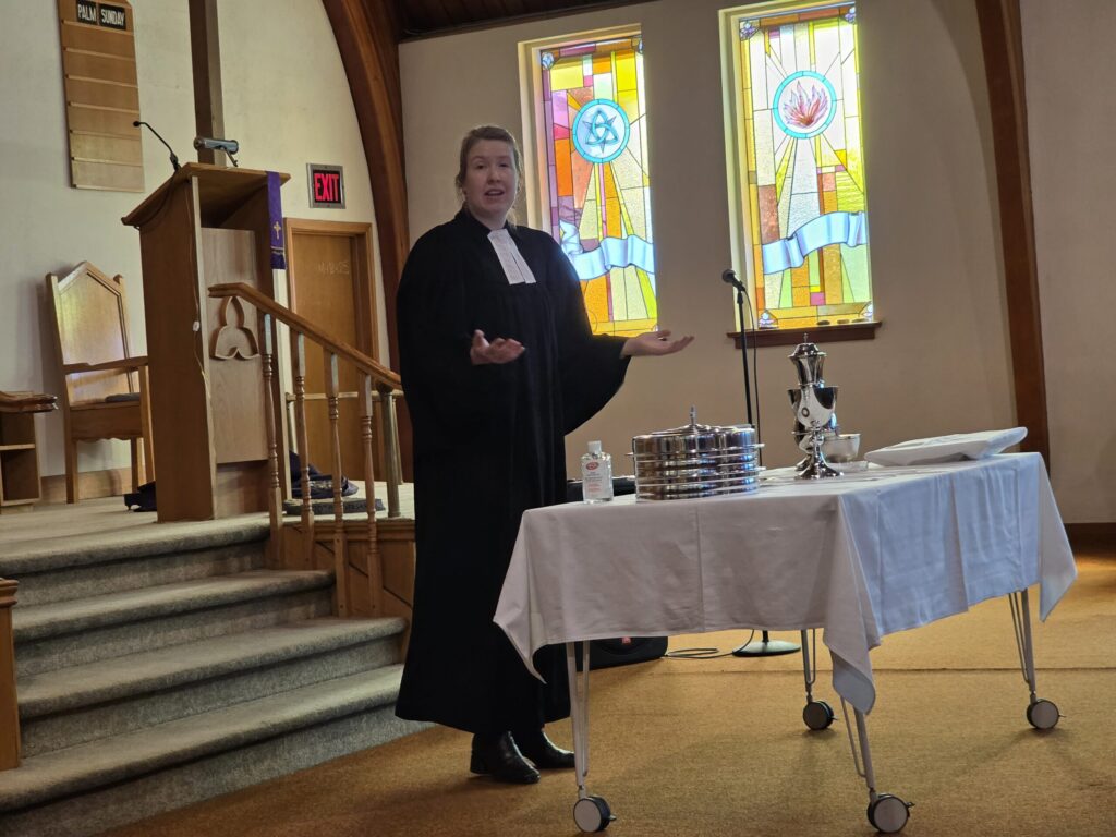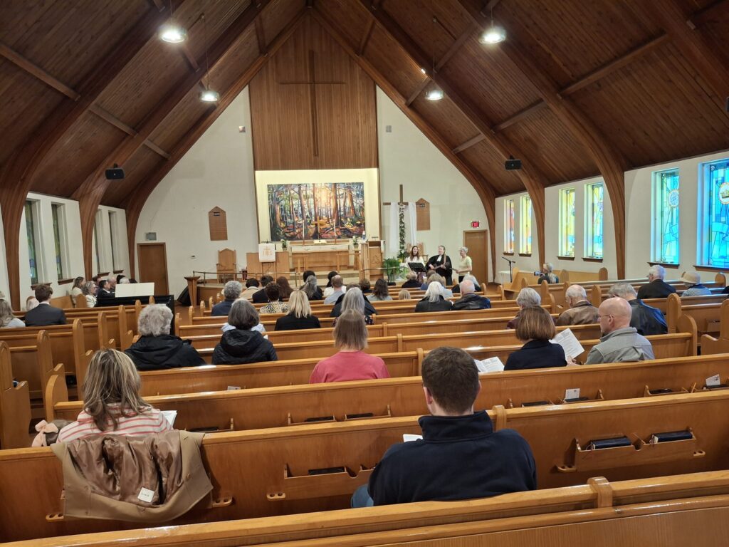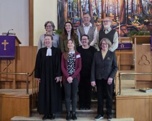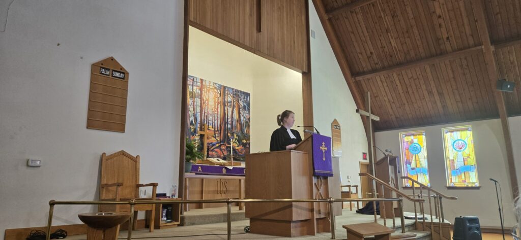 Pastor Annika Klappert led an inspiring Palm Sunday service on March 29, 2026 to mark the beginning of Holy Week. Our church choir performed “Palmsonntagslied” under the direction of Linda Marcinkus as part of the prelude during the procession of this year’s church council into the church. The choir also sang “Jerusalem”. Some of those in attendance also participated in the service by reading the Gospel and Prayers of Intercession, as well as helping with Holy Communion. In the sermon Pastor Klappert connected the Gospel to her vision of the congregation as she sees it represented in the altar art.