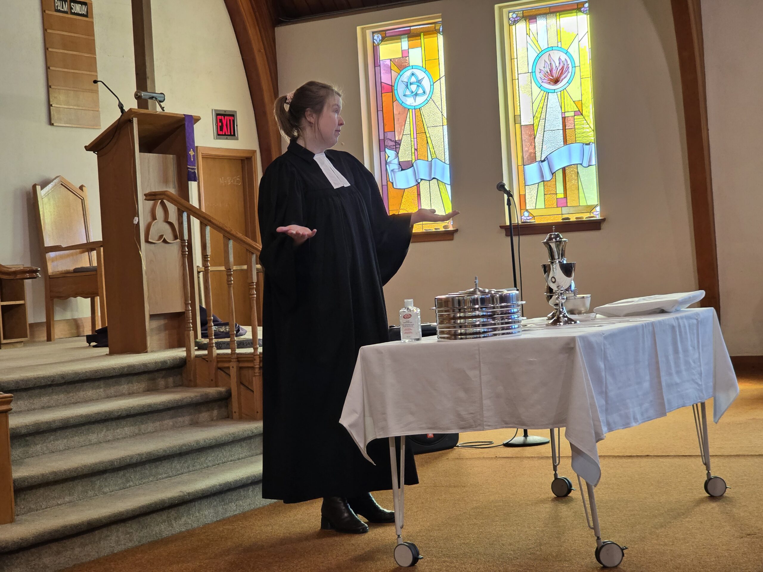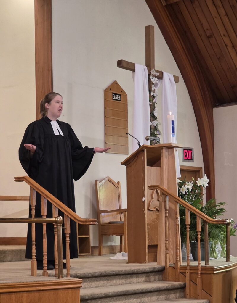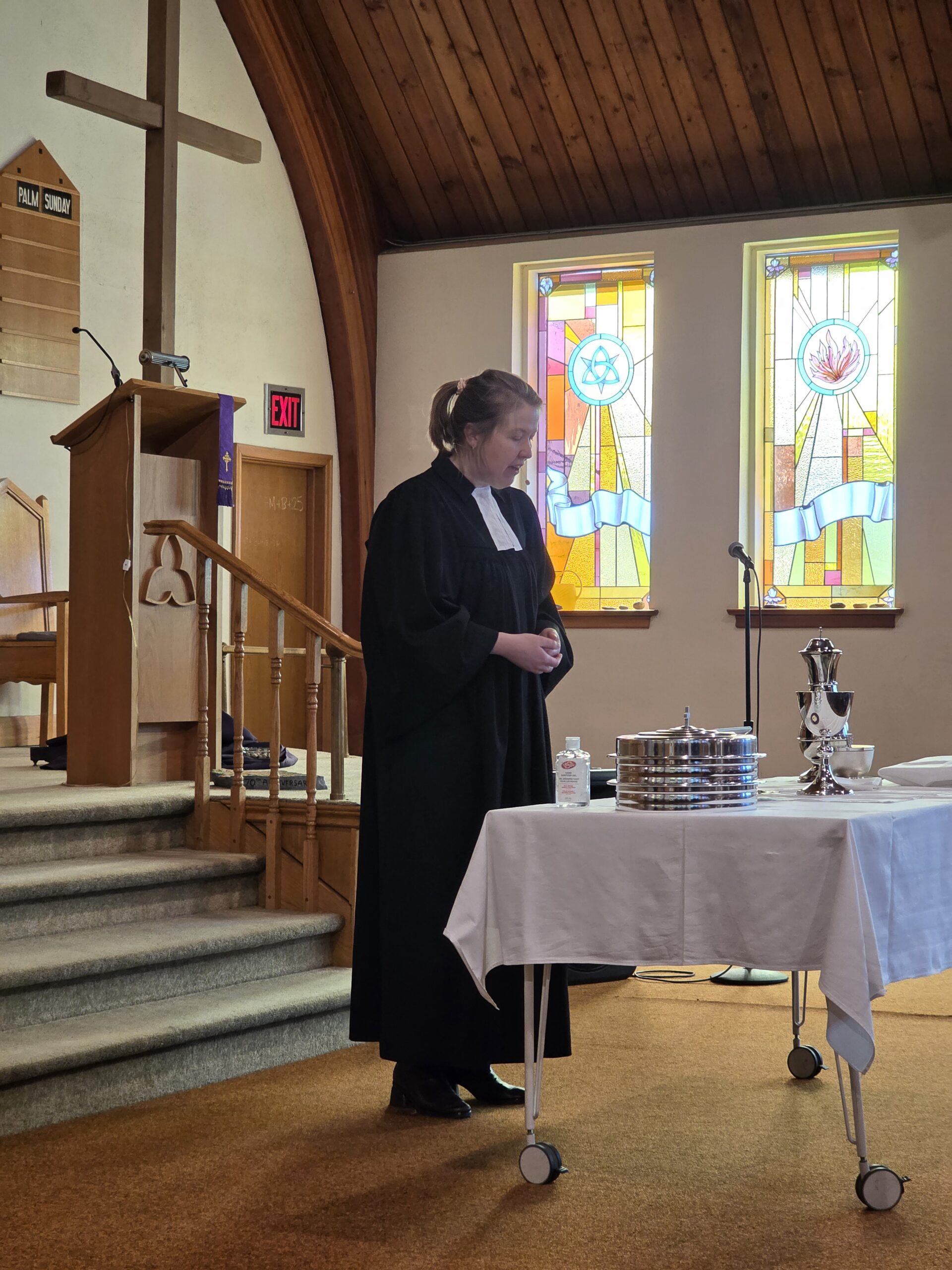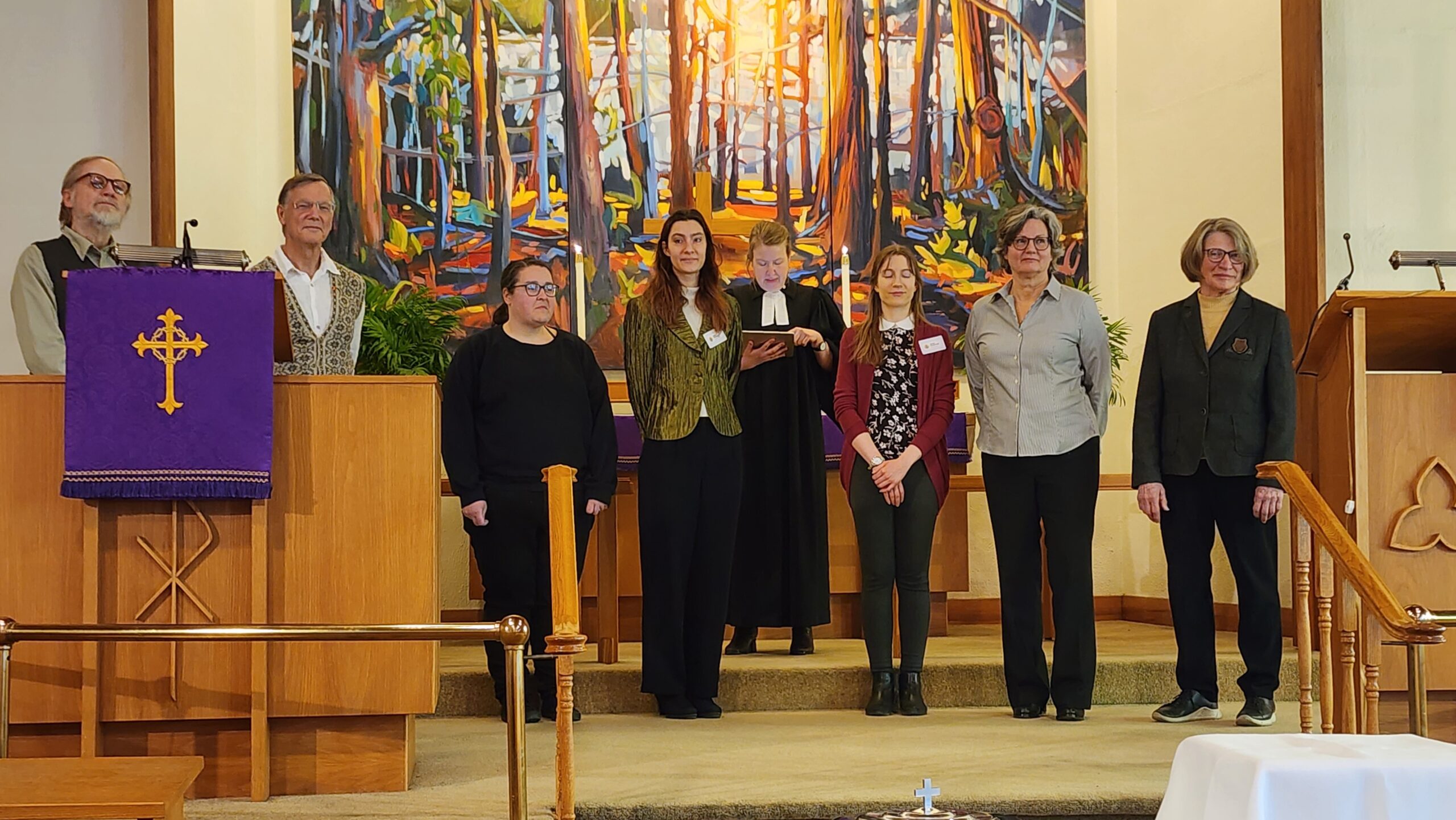 Pastor Annika Klappert led an inspiring Palm Sunday service on March 29, 2026 to mark the beginning of Holy Week. Our church choir performed “Palmsonntagslied” under the direction of Linda Marcinkus as part of the prelude during the procession of this year’s church council into the church. The choir also sang “Jerusalem”. Some of those in attendance also participated in the service by reading the Gospel and Prayers of Intercession, as well as helping with Holy Communion. In the sermon Pastor Klappert connected the Gospel to her vision of the congregation as she sees it represented in the altar art.