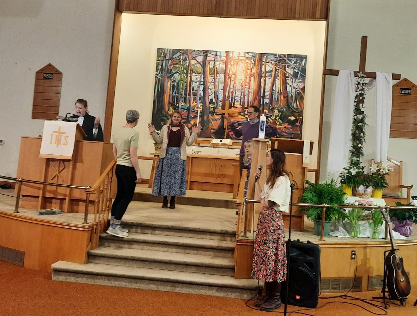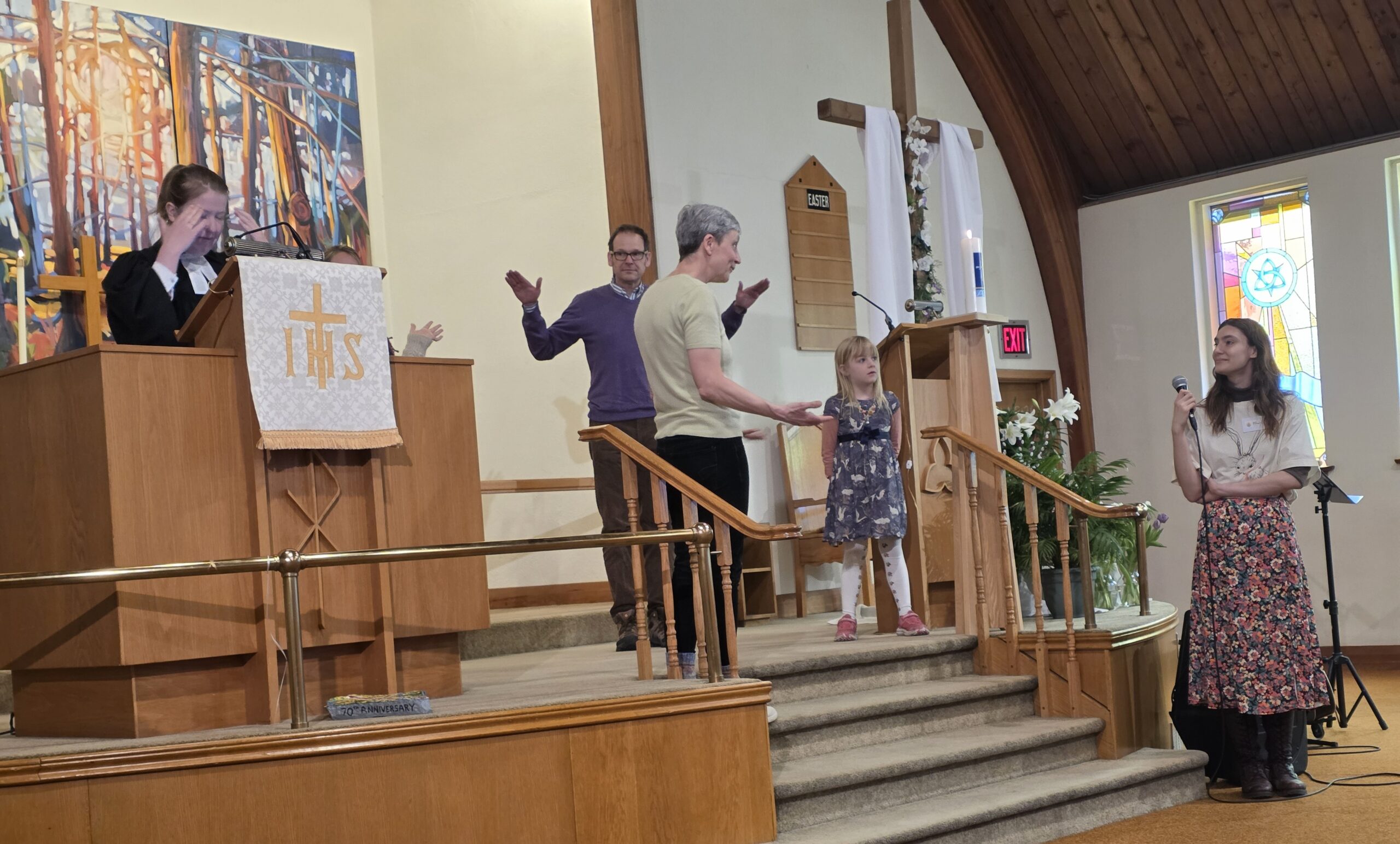 The Easter festivities culminated in an 11:00 am German-English worship service, attended by approximately 75 people! Joyful hymns were sung by the choir, and Pastor Annika, Sonja, and Iris led a rendition of “Here Comes The Sun”. A creative sermon involved the participation of various audience members, who re-created the scene of Mary at the open tomb. Children and adults alike enjoyed an easter chocolate treat after the service! Thank you to Annette Rowles for decorating the altar so beautifully again this year.