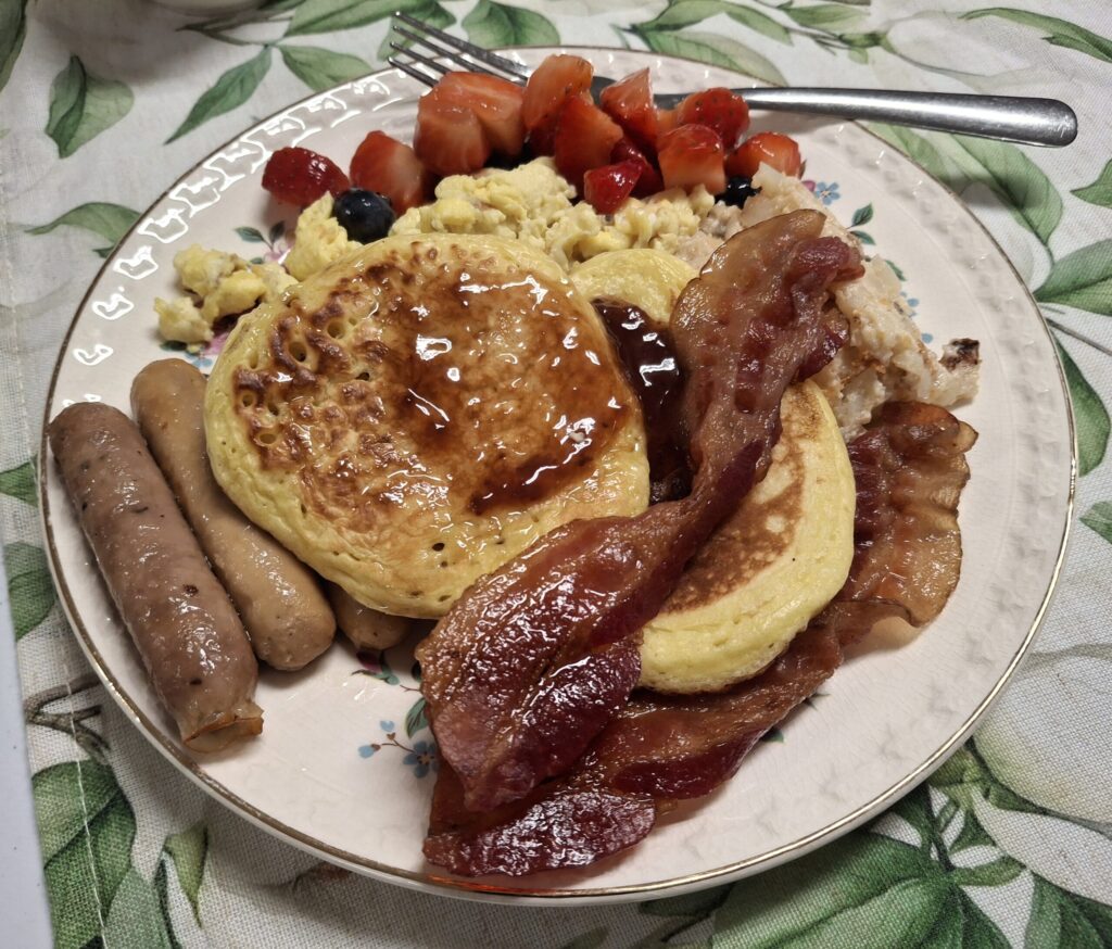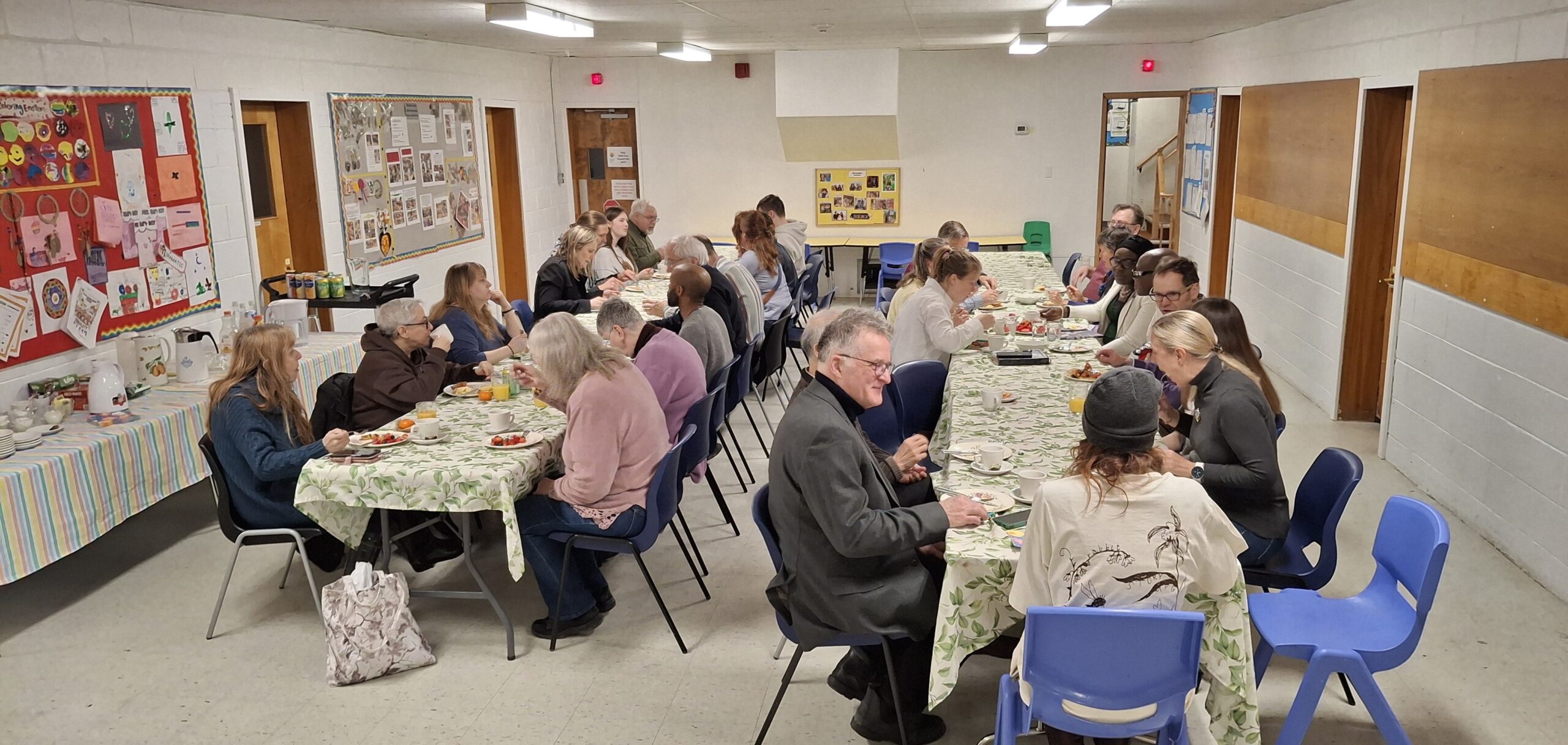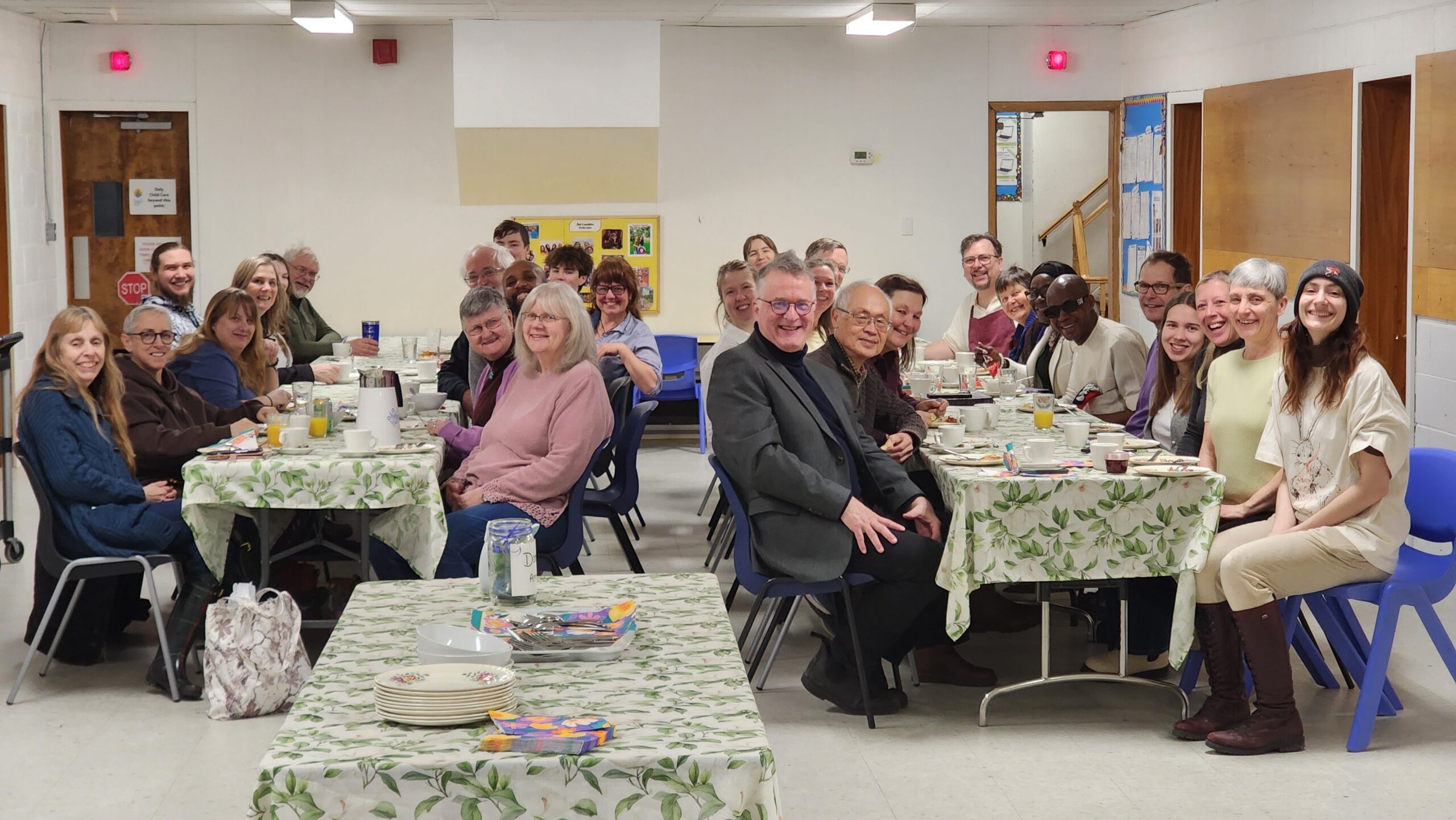 After the Sunrise Service, about 30 people came back to Martin Luther Church to enjoy a hearty breakfast at 8:30am. The team prepared a feast of scrambled eggs, hashbrowns, bacon, turkey sausages, toast, fluffy pancakes and maple syrup, and a tasty fruit salad. Yogurt, clementines, and watermelon were welcome additions. A big thank you to everyone who helped with set-up and clean-up!
