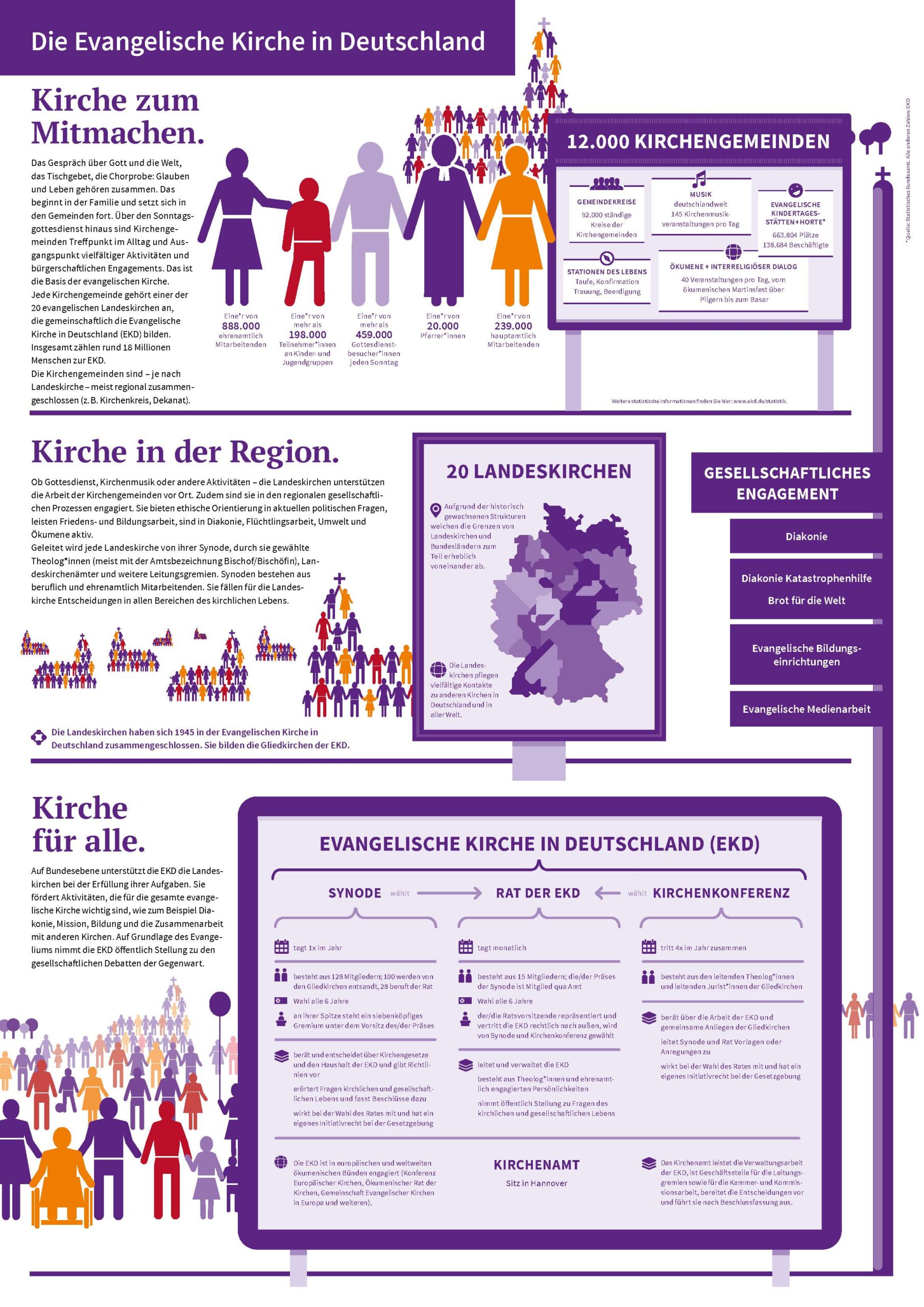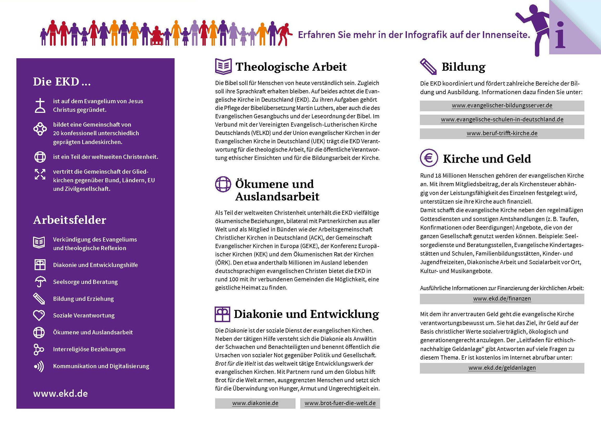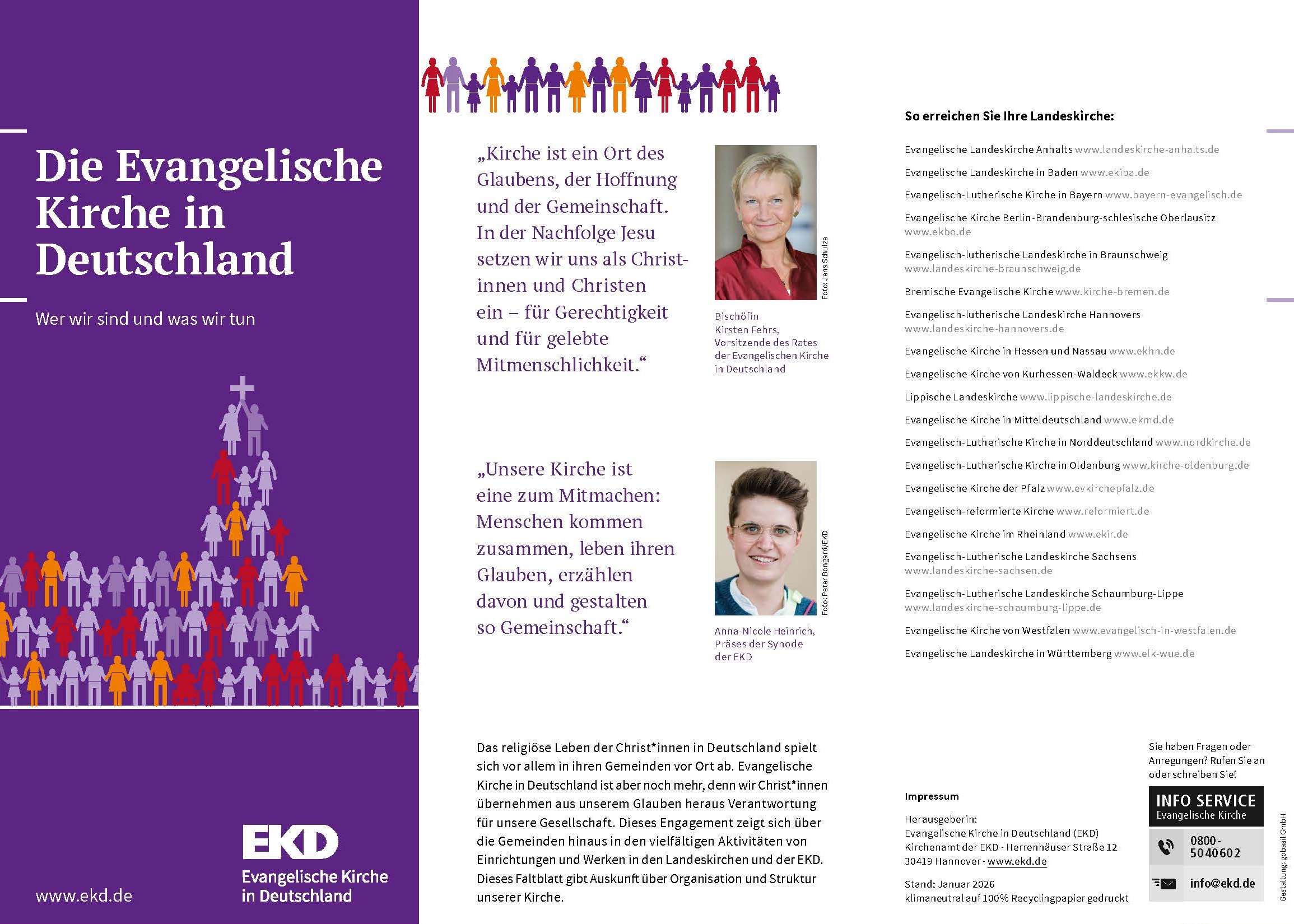 The new flyer “The Evangelical Church in Germany – Who We Are and What We Do” provides a concise explanation of the structure, tasks, and financing of the EKD (Evangelical Church in Germany). It offers insights into key areas of work and makes it clear: the EKD is a church where participation is encouraged. Quickly find out more.
